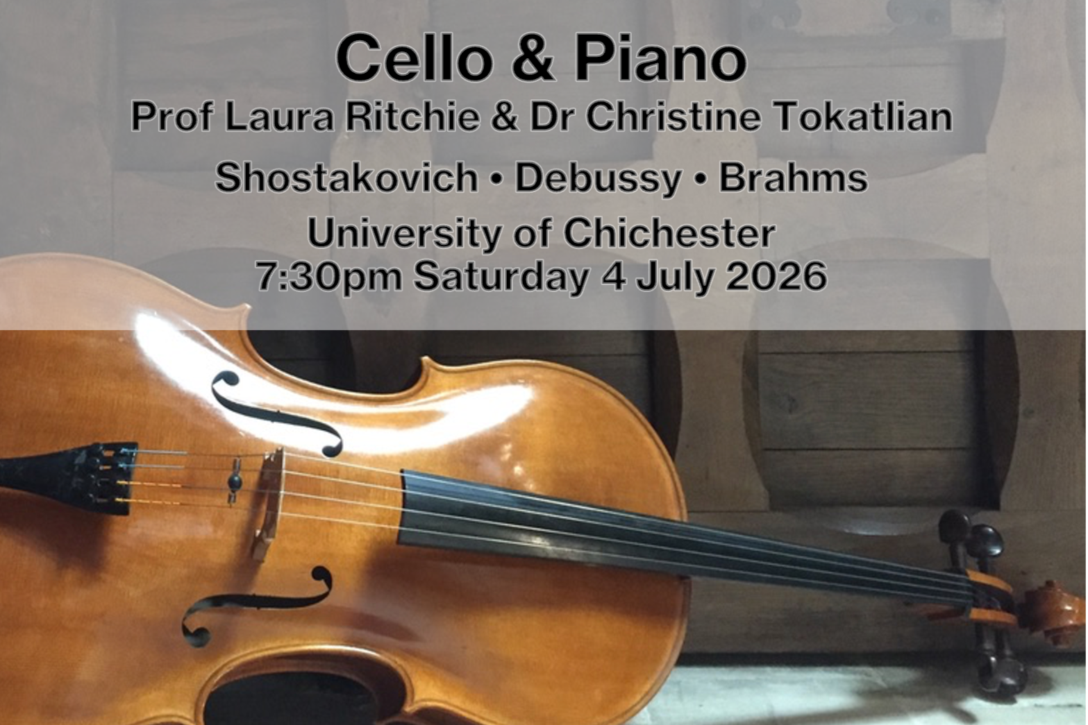 This concert features cello & piano sonatas from the Romantic period. Alongside these Laura and Christine present three short, deeply moving, melodic contemporary works: Schnittke’s Musica Nostalgica, composed in 1992; Dr Spiros Mazis’ Adagio, composed in 2016; and Dr Jill Jarman’s Prelude, composed in 2025.